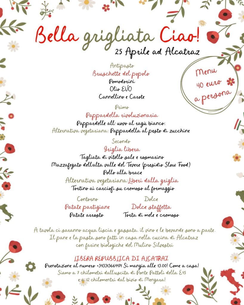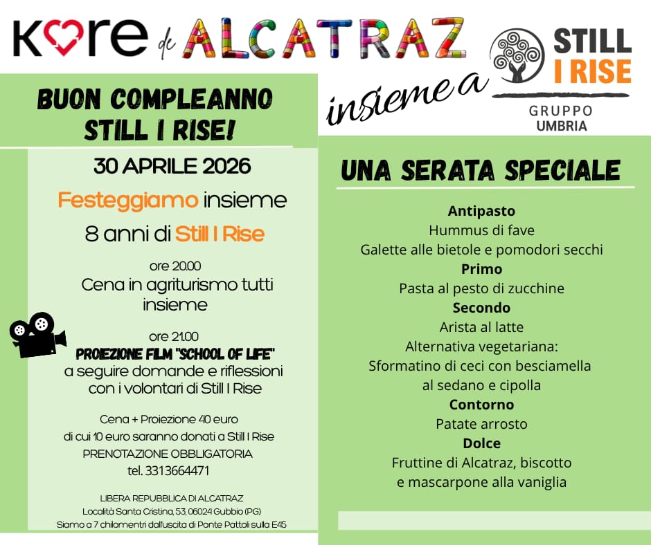 L’Agriturismo della Libera Repubblica di Alcatraz, gestito dalla Cooperativa Kore de Alcatraz, è finalmente aperto dopo mesi di attese e burocrazie! Vi aspettiamo nei giorni di apertura che trovate alla pagina “Calendario Eventi“, ma siamo anche a disposizione per organizzare le tue occasioni speciali: pranzi, cene, merende, momenti di formazione aziendale, ritiri yoga e attività di gruppo. Puoi prenotare la nostra struttura per organizzare il tuo corso, oppure per venire a mangiare con i tuoi amici e le tue amiche. Il ristorante dell’Agriturismo apre su prenotazione per gruppi di minimo 10 persone, vi aspettiamo!