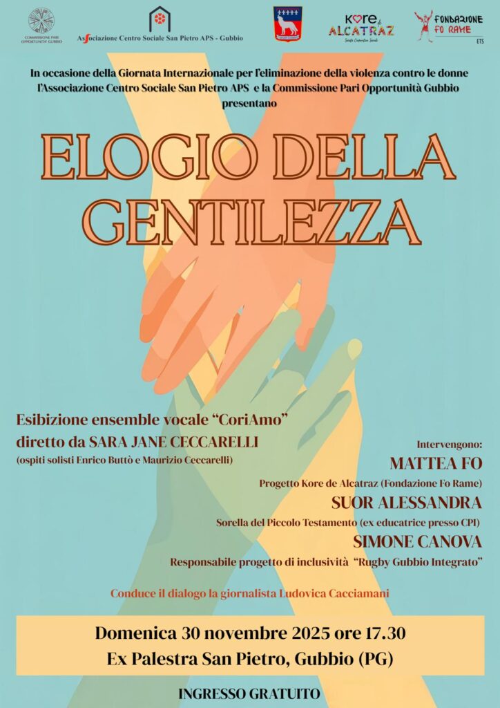 In occasione della Giornata Internazionale per l’eliminazione della violenza sulle donne (che cade il 25 novembre di ogni anno) il Centro Sociale San Pietro APS, la Commissione Pari Opportunità Gubbio e la direttrice artistica per l’occasione, la cantante Sara Jane Ceccarelli, organizzano una giornata di musica e parole aperta al pubblico, che si svolgerà presso la Ex Palestra di San Pietro a Gubbio (PG) domenica 30 novembre 2025 dalle ore 17,30, con ingresso gratuito. L’evento è patrocinato dal Comune di Gubbio.